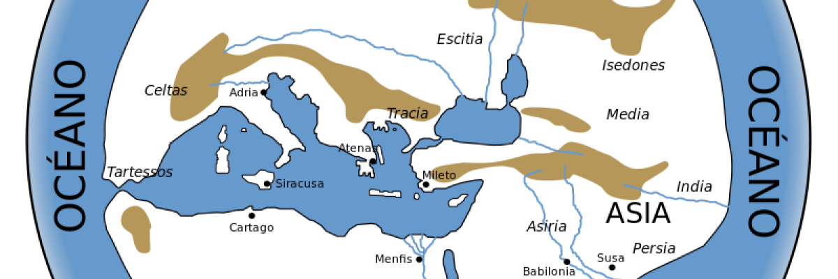 Imagen de entrada: Reconstrucción hipotética del mapamundi de Hecateo de Mileto (550 a. C.-476 a. C.), en el que se representa la Tierra conocida (Asia y Europa) como un disco rodeado por el Océano. Vía WikiMedia (Dominio público)