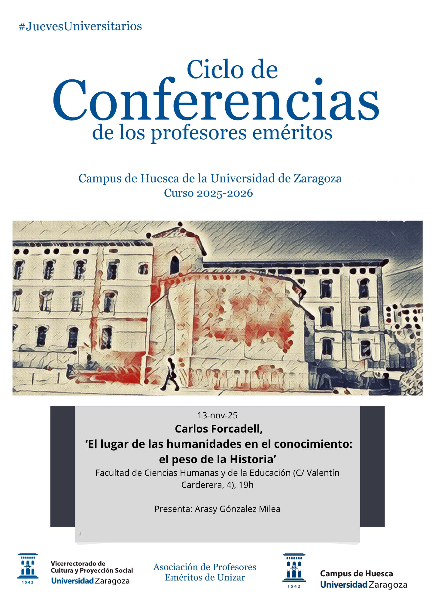 (Huesca, 12 de noviembre de 2025) ‘El lugar de las humanidades en el conocimiento: el peso de la Historia’ es el título de la conferencia que impartirá Carlos Forcadell este jueves, 13 de noviembre, en el Campus de Huesca. El catedrático de Historia Contemporánea de Unizar abordará en esta sesión “la importancia decisiva” de los conocimientos humanísticos, no solo para la educación, el disfrute cultural y la comprensión del mundo, sino también para el ecosistema global del conocimiento humano y para el funcionamiento de las sociedades democráticas. La Facultad de Ciencias Humanas y de la Educación (c/ Valentín Carderera, 4) acogerá, a las 19 horas, esta ponencia, con la que se abre una nueva edición del Ciclo de Conferencias de los Profesores Eméritos en el Campus altoaragonés. Arasy González Milea, docente de la Facultad anfitriona, introducirá esta sesión, que está abierta al público.