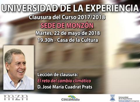 ‘El reto del cambio climático’ es el título de la conferencia de clausura del curso de la Universidad de la Experiencia UEZ) en Barbastro y Monzón. José María Cuadrat Prats, catedrático de Geografía y Ordenación del Territorio de la Universidad de Zaragoza, especialista en Climatología, y participante en diversos estudios gubernamentales sobre esta cuestión, será el ponente en estos actos, que están abiertos al público.
